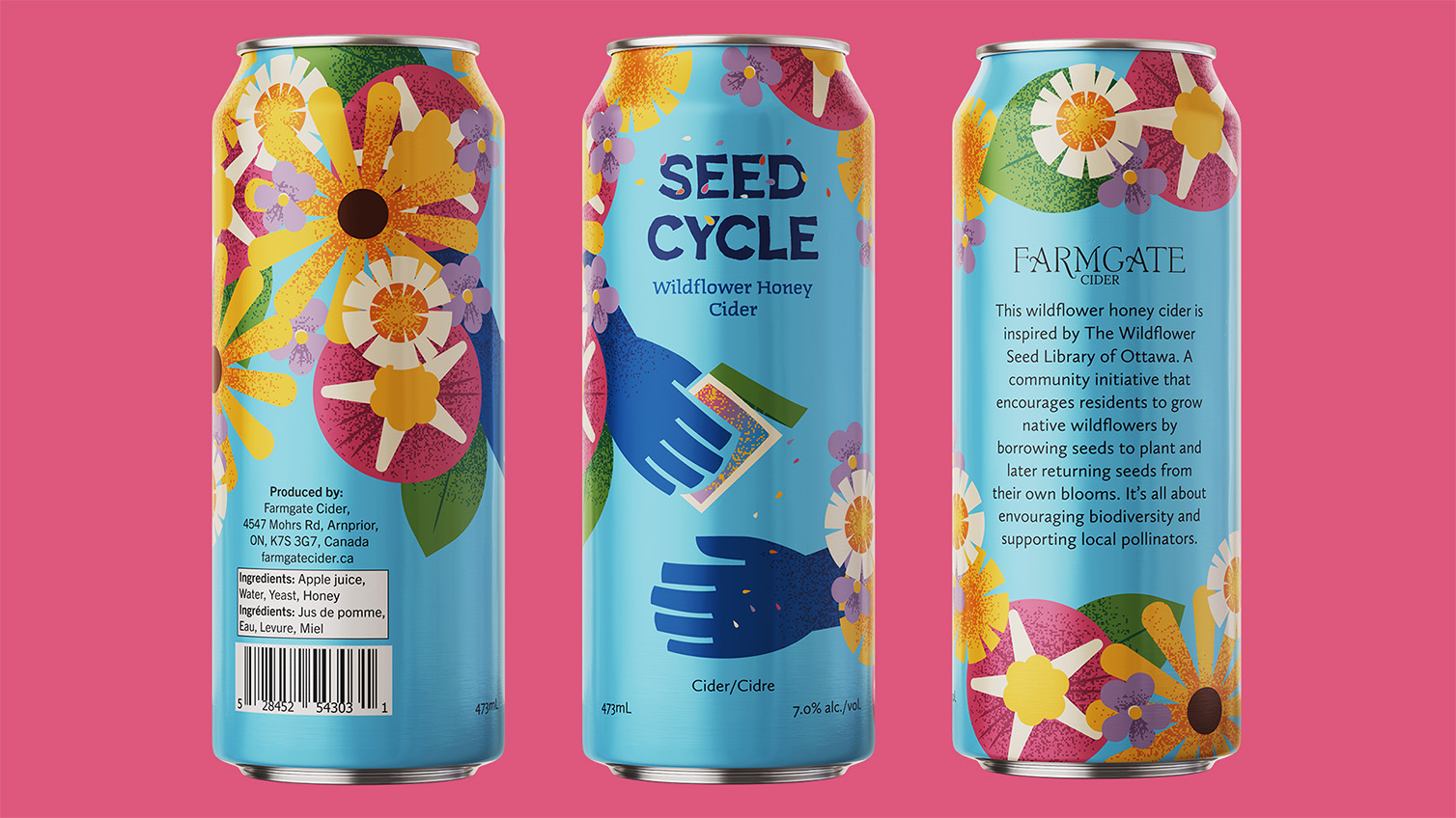 These can design concepts are for Farmgate Cider, a small family run cider company that values nature, family, and hard work. Both designs are based on community efforts to preserve and help nature. While they have vastly different colour palettes, the set still appears cohesive through illustration style and layout.