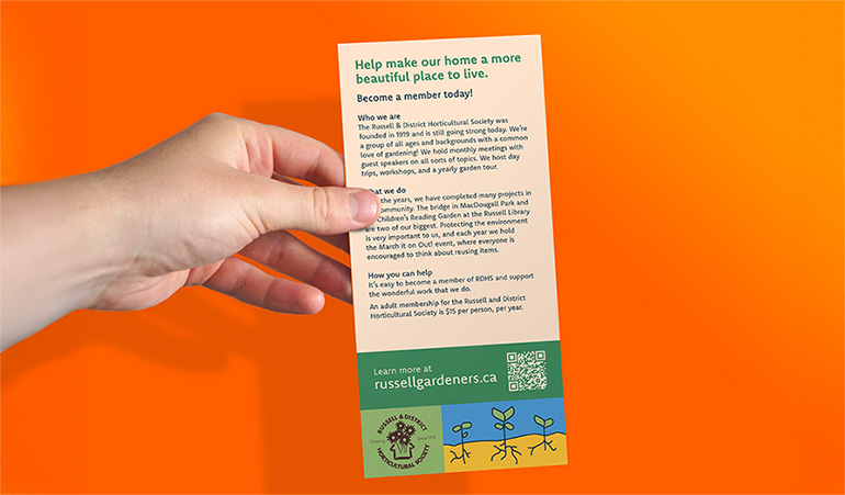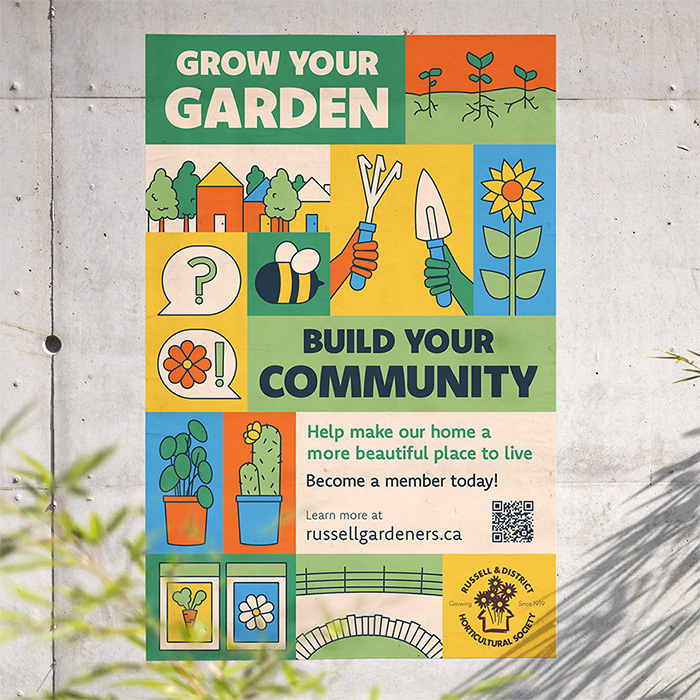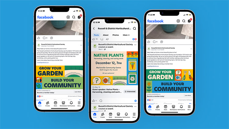 This campaign was for The Russell & District Horticultural Society, a group that teaches members about gardening and performs community projects and events focused on sustainability and plant care. Their efforts make the area more beautiful for it’s residents, while connecting people and supporting local businesses with events and sales. The goal of this campaign was to promote the group and encourage new membership sign ups through small scale advertisements and social media.